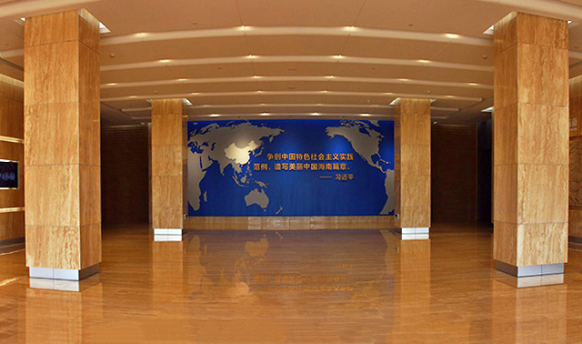展馆活动序厅位于展馆大门入口,展厅风格稳重,色彩亮丽,以“国家关注·印象海南”为主题,展示海南在世界的位置的主题形象墙,集取海南部分具有代表性的山、海、民居和风景名胜元素的印象海南浮雕墙,以及历届党和国家领导人情系海南,对海南的亲切关怀。 -
