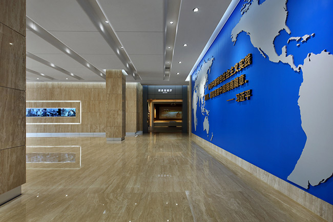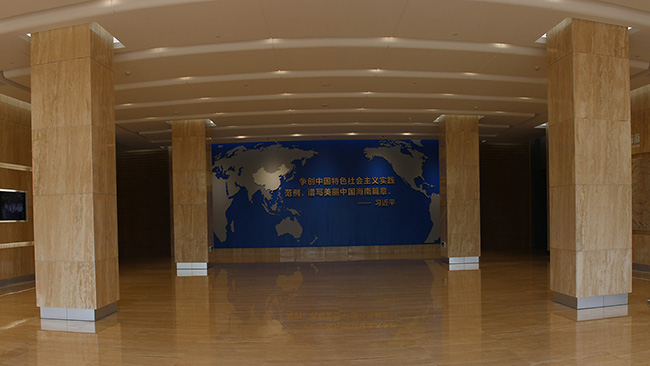 序厅位于展馆大门入口,展厅风格稳重,色彩亮丽,以“国家关注·印象海南”为主题,展示海南在世界的位置的主题形象墙,集取海南部分具有代表性的山、海、民居和风景名胜元素的印象海南浮雕墙,以及历届党和国家领导人情系海南,对海南的亲切关怀。