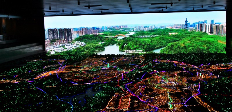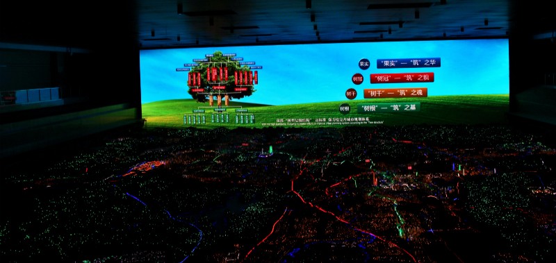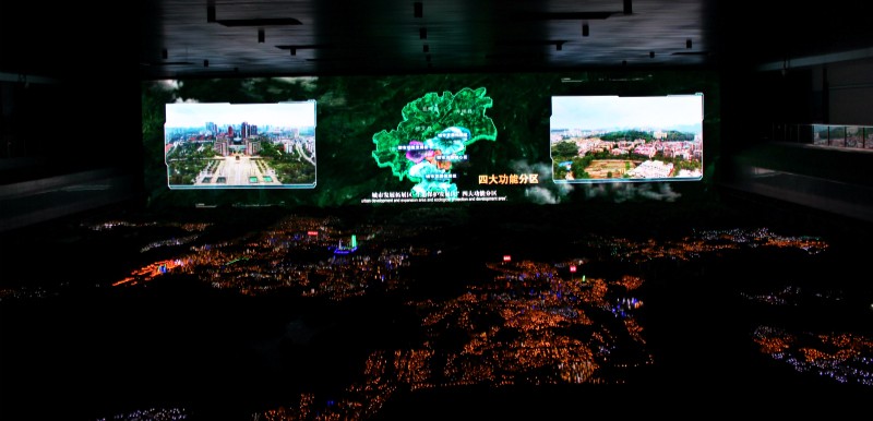 沙盘演绎展区:物理实体沙盘模型比例1:1050,面积1540平方米,数字沙盘影像模型投影面积为1340平方米。数字沙盘播放影片“多彩贵州”、物理沙盘播放影片“打造创新型中心城市”。物理实体沙盘模型与数字沙盘相互辉映,既可观览实体模型的逼真效果,又能感受到数字沙盘带来的海量信息。以多感观、多方位的全景展示方式,描绘了贵州省、贵阳市城乡建设发展的现状和美好未来。