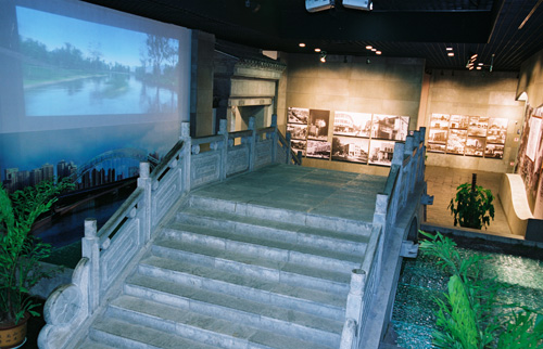 观众站在复原的古桥上观看常州京杭运河的几度变迁,运用多媒体技术的视觉效果,展示古运河的发展和新运河的规划。