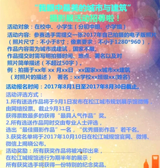活动主题:“我眼中最美的城市或建筑”;活动对象:在校中、小学生(分初中组、小学组);活动内容:参赛选手需提交一张2017年自己拍摄的电子版照片(照片尺寸:不小于8寸;像素要求:不小于1280*960),作品内容需为城市或建筑,国家不限。作品提交时需写明拍摄时间、地点、署名以及对照片的简单描述(不超过50字)。