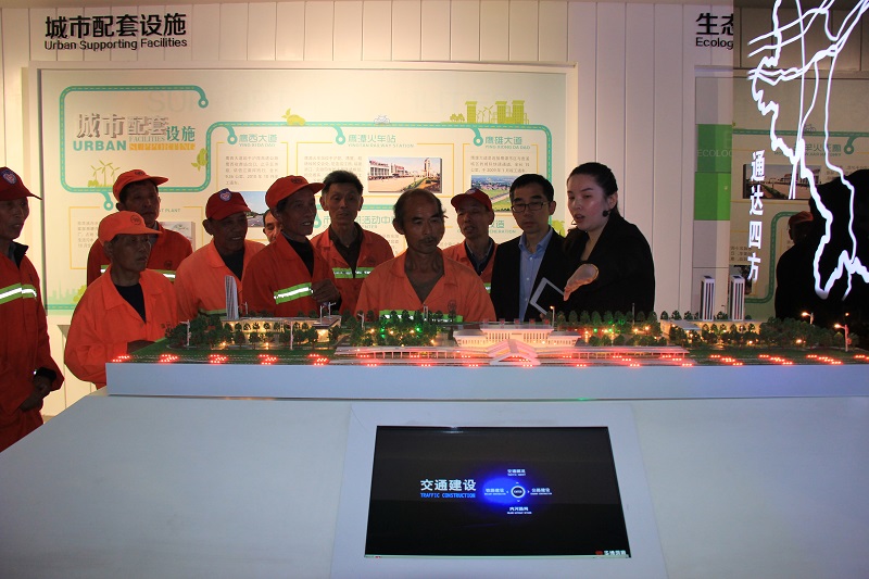 干净整洁的市容市貌是一座城市的名片,而被誉为“城市美容师”的环卫工人每天用双脚丈量着城市的道路,用双手装扮着城市的容颜。此次来到鹰潭城市规划展示馆参观,来共同见证他们用辛勤双手换来的城市文明之变。 环卫工人在鹰潭城市规划展示馆讲解员的陪同下,参观了历史沿革墙、名人名事、鹰潭八景等展区,观看了实景沙盘,在360度环幕影院欣赏了未来鹰潭发展蓝图的影片,讲解员还向环卫工人们简要介绍了我市正在全力打造的“智慧新城”,用美丽鹰潭规划建设成果致敬“城市美容师”。