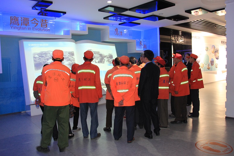 环卫工人汪冬映大爷说:“这是我第一次到展示馆来,也是第一次知道我天天打扫的街道、城市是个啥样,也才知道原来我们鹰潭也有高铁了,还有城市也能变‘聪明’了。”